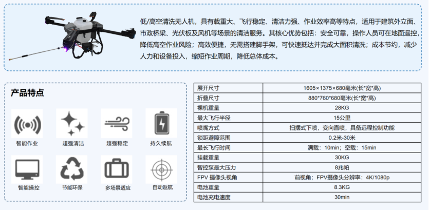 自动化清洗模块:集成距离传感组件与清洗执行机构,无人机可按预定航线飞行,自动保持与清洗面的最佳距离,同步完成清洗液喷洒与刷洗作业,无需人工干预。