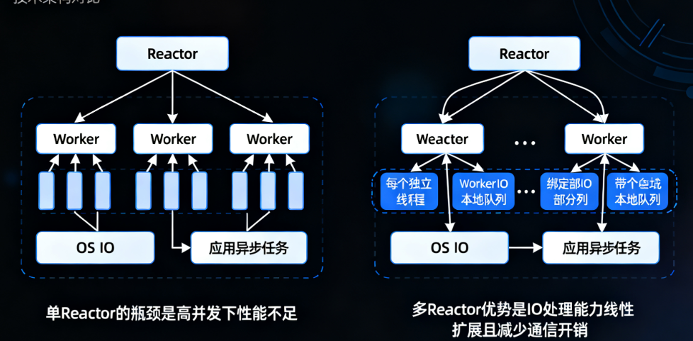 - 每个Worker线程会关联一个Reactor,减少跨线程通信开销。