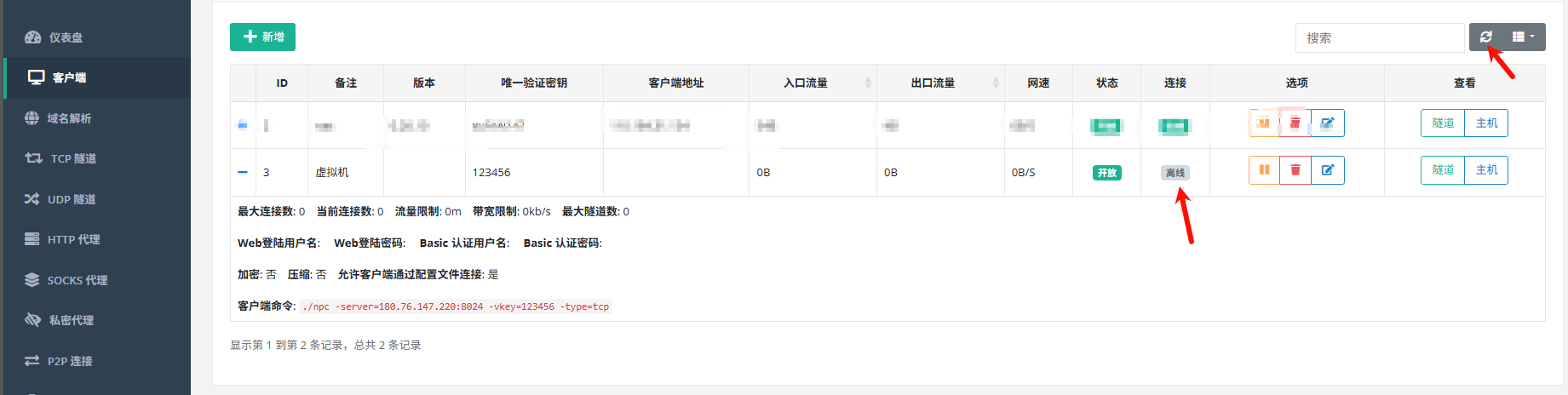 出来后点击右上角刷新就就可以看到客户端状态,这里离线是还没开始配置客户端: