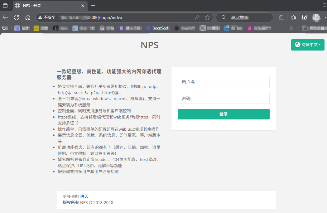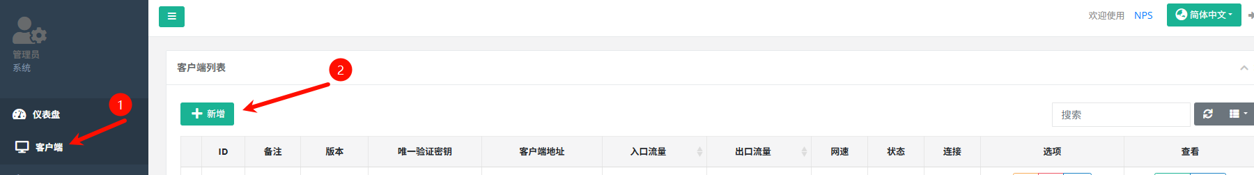 到这里就可以使用浏览器访问云服务公网IP加上默认端口8080访问nps管理端(默认用户名admin,密码:123)
