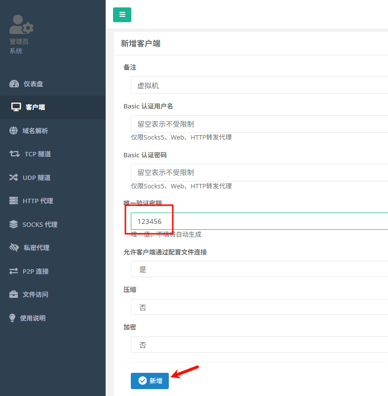 设置个备注和密钥(客户端要用),其他暂时就不用改了,点击新增即可