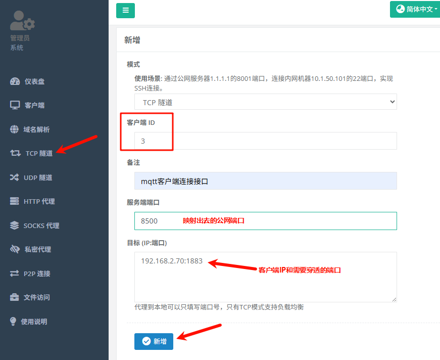 开始在nps管理端新增端口穿透(注意公网端口要在云平台添加安全策略开放端口):