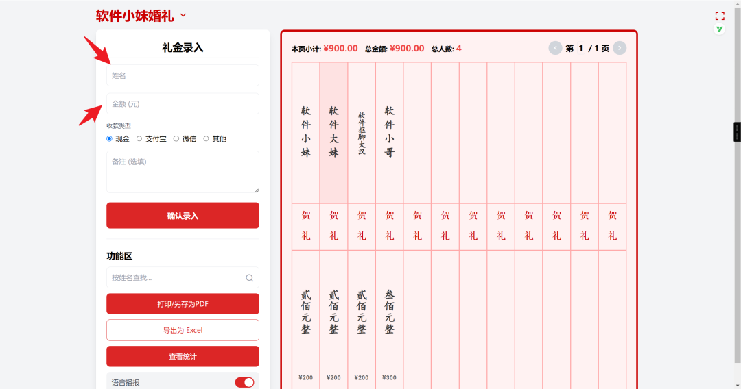 录入界面支持选择姓名、金额和收款类型,数据录入后支持打印和导出功能。