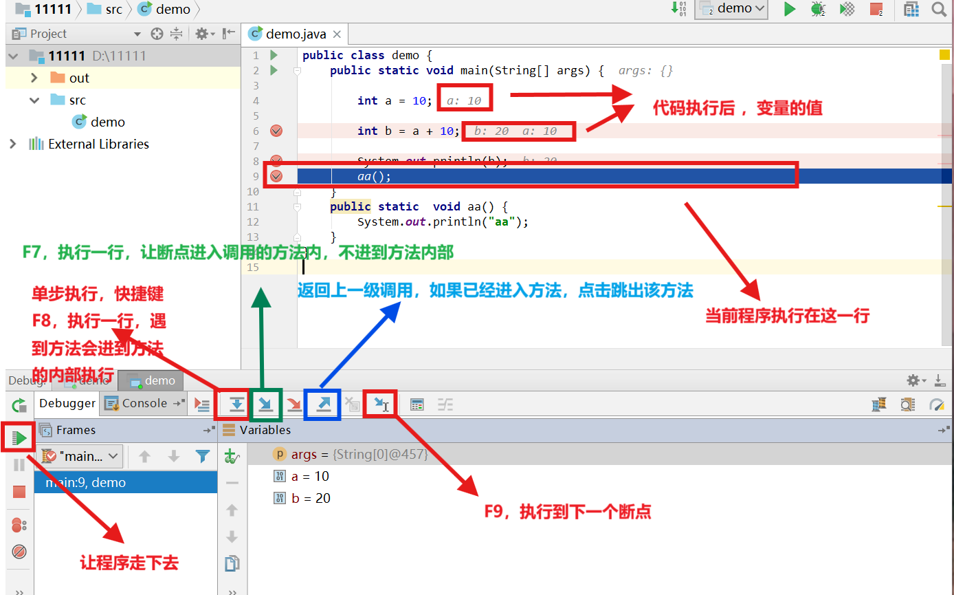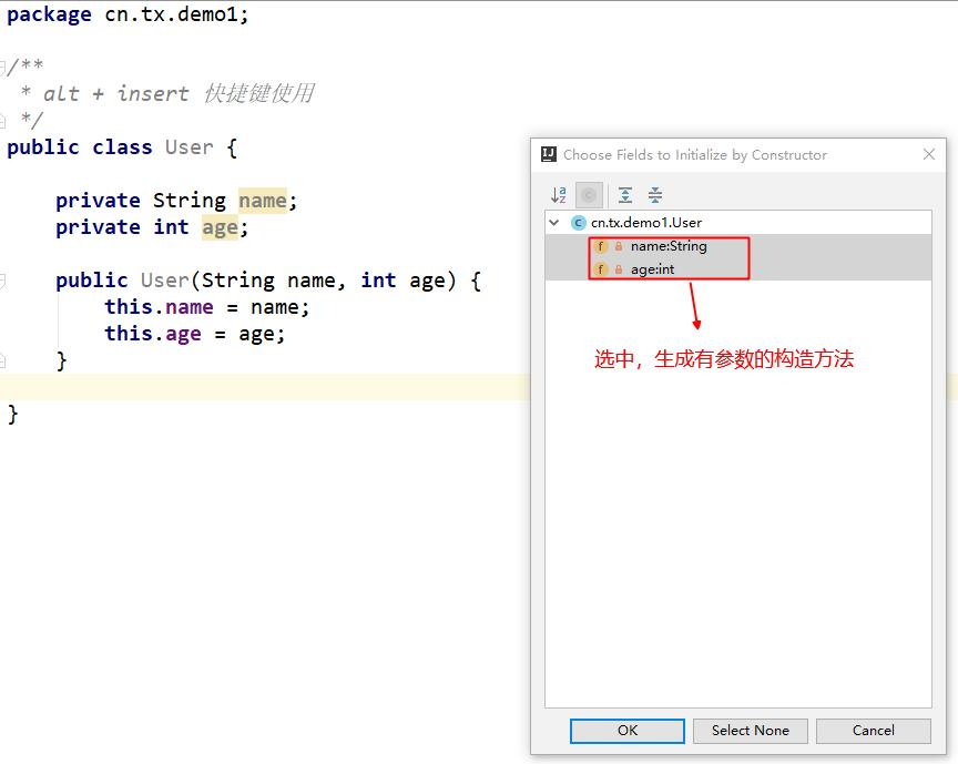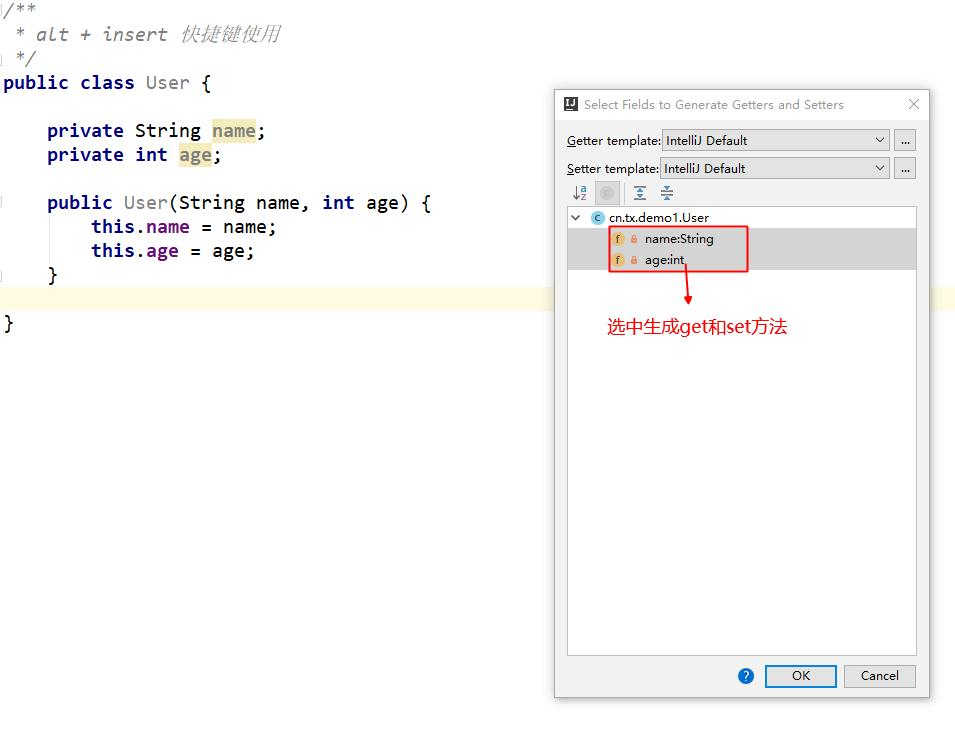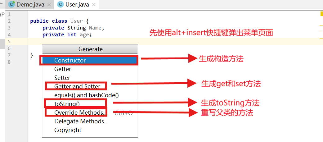 - Alt + insert :生成构造方法、get 和 set 方法、重写 toString()的方法、重写父类的方法等