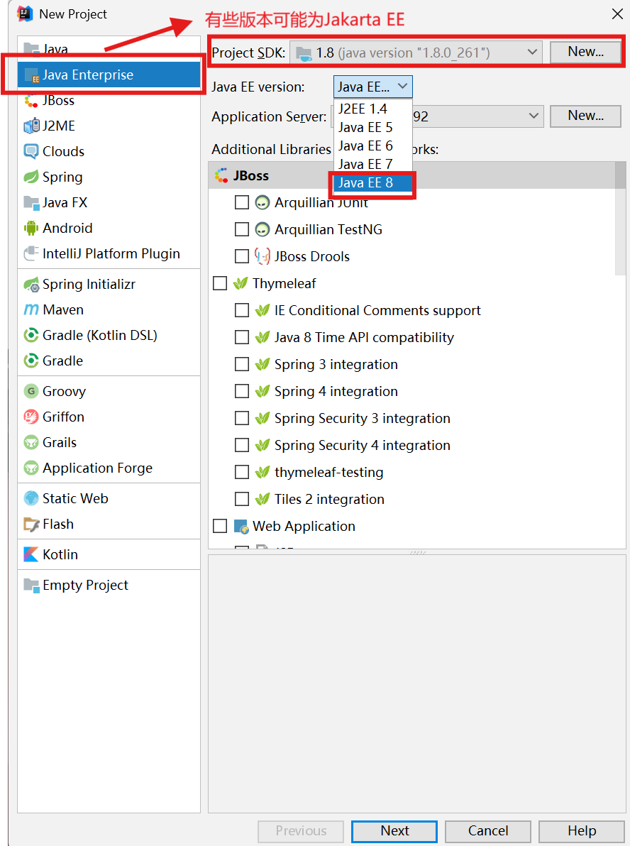 左侧选择项目类型,右侧配置本地JDK,选择JavaEE8,它是 Java EE 系列中较新的稳定版本,能满足大部分 Java Web 开发场景的需求。