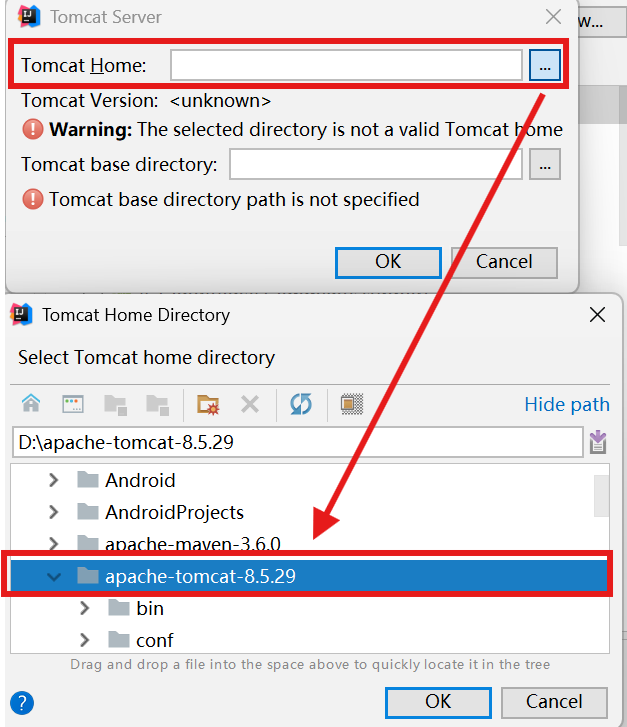 选择tomcat的安装根目录(即包含 bin、conf、webapps 的那一层),这里注意,如果是多层嵌套目录,必须选择bin目录的上一层: