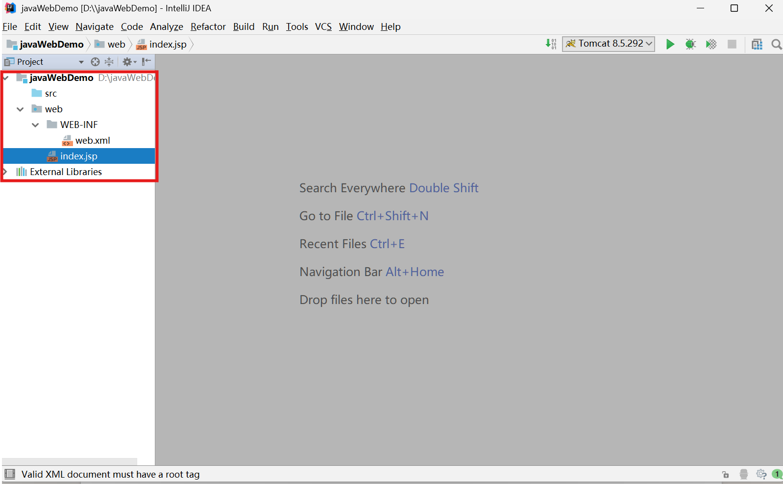 创建好的Javaweb项目左侧的目录应该如图,如果缺少任一目录或文件,需手动补充完整: