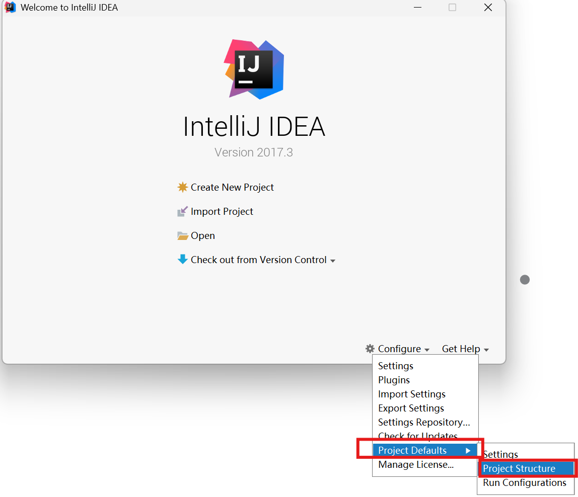 使用 idea 开发代码,需要配置 jdk 的开发环境,在 idea 开始界面,选择 Configure--> Project Defaults-->Project Structure 进行配置: