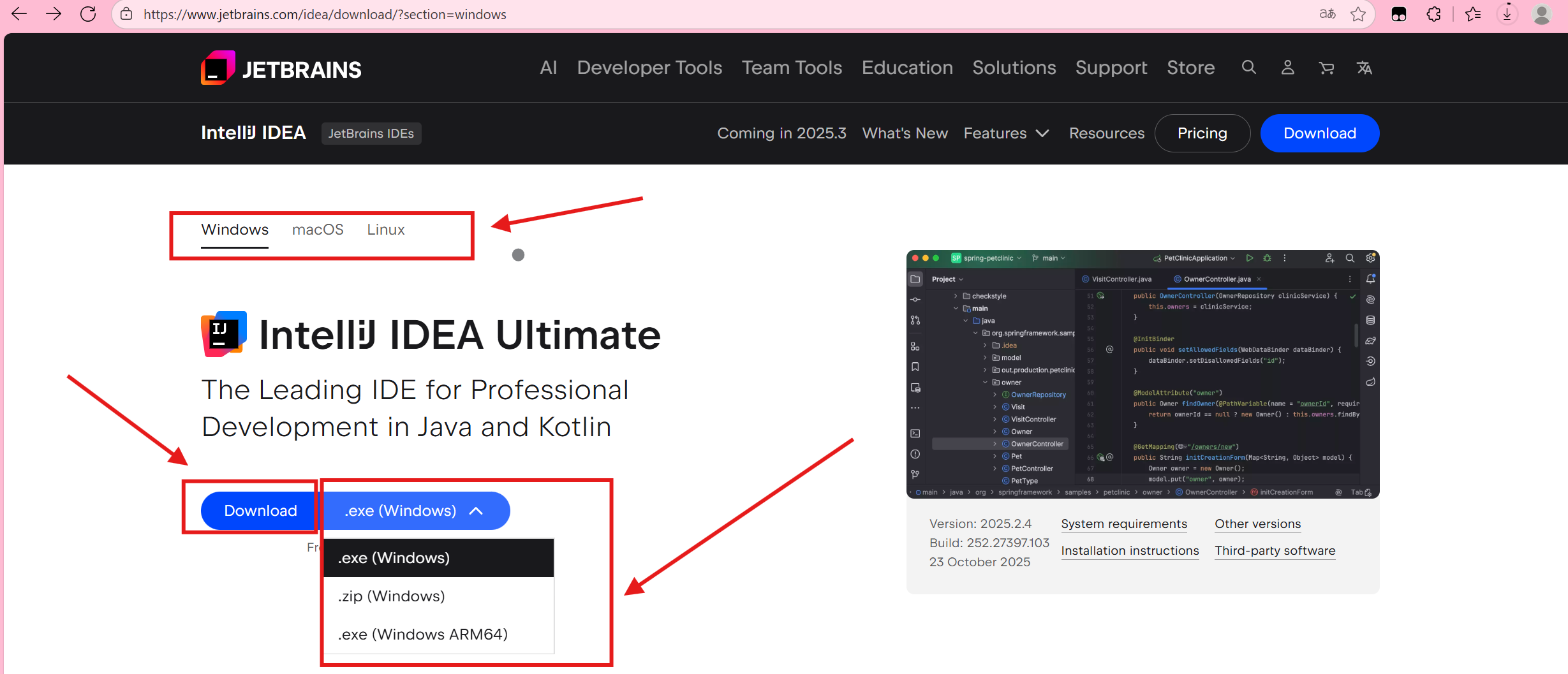 先去 idea 的官方网站:https://www.jetbrains.com/idea 下载 idea 的安装包文件,选择版本和自己的操作系统后,选择下载方式,点击DOWNLOAD 进入到下载页面。