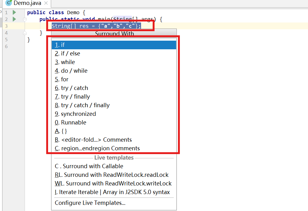 - Ctrl + alt + t (先选中需要包围的代码行,再按快捷键):生成流程控制语句