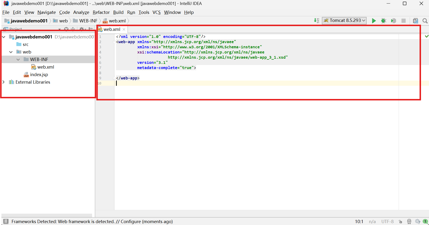 把这份文件中的内容拷贝到新建的javaweb项目的web.xml文件中,并把注释删掉,就剩下对项目的约束,现在就是一个满足基本结构的javaweb项目: