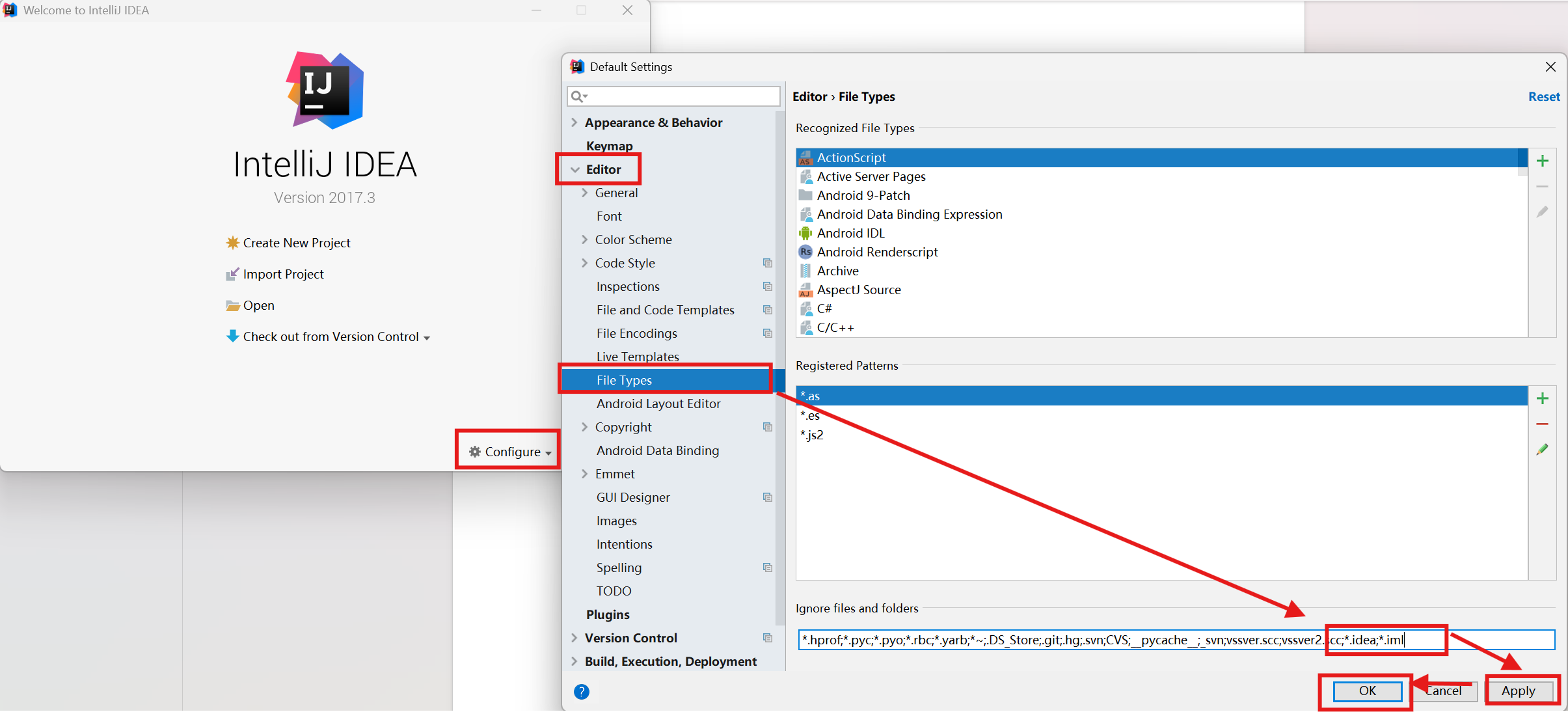 Configure-->settings-->Editor-->File Types --> 添加 "*.idea;*.iml; "