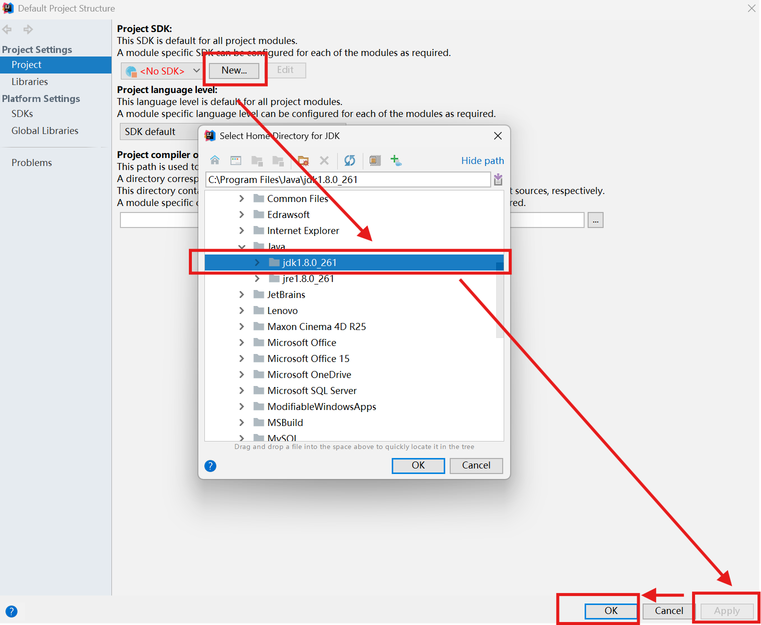 点击"New"按钮,选择本地的JDK,按箭头顺序操作,JDK就配置完成了: