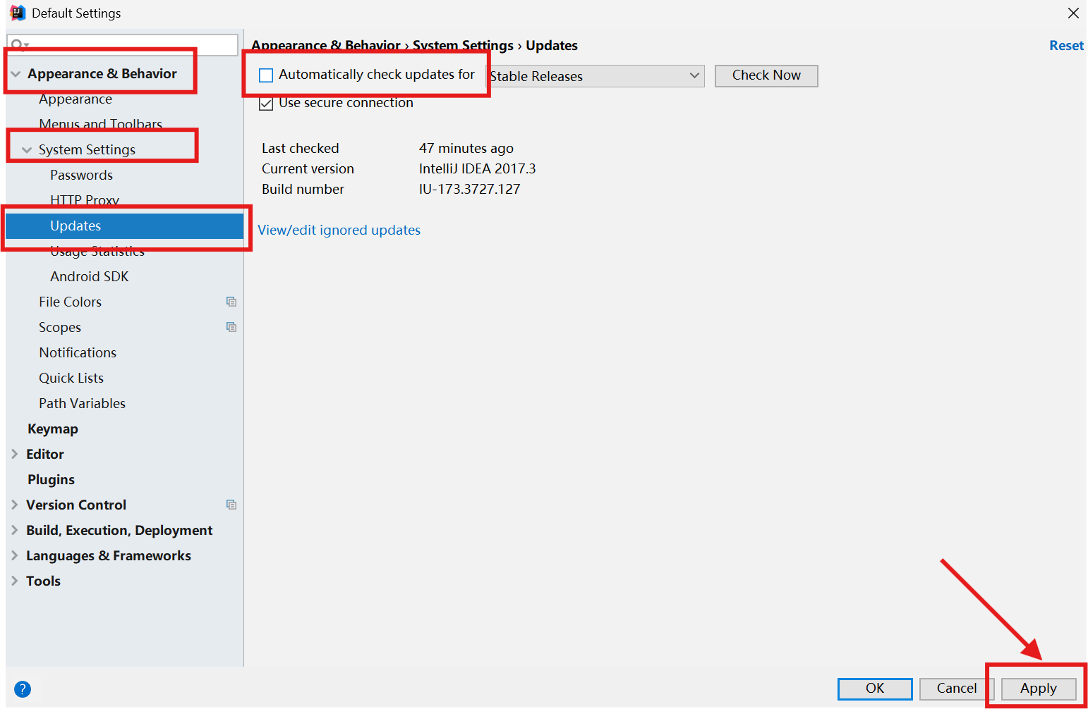 Appearance & Behavior-->System Settings-->Updates-->取消 Automatically check updates for 勾选,完成后点击"Apply",然后点击"OK"。