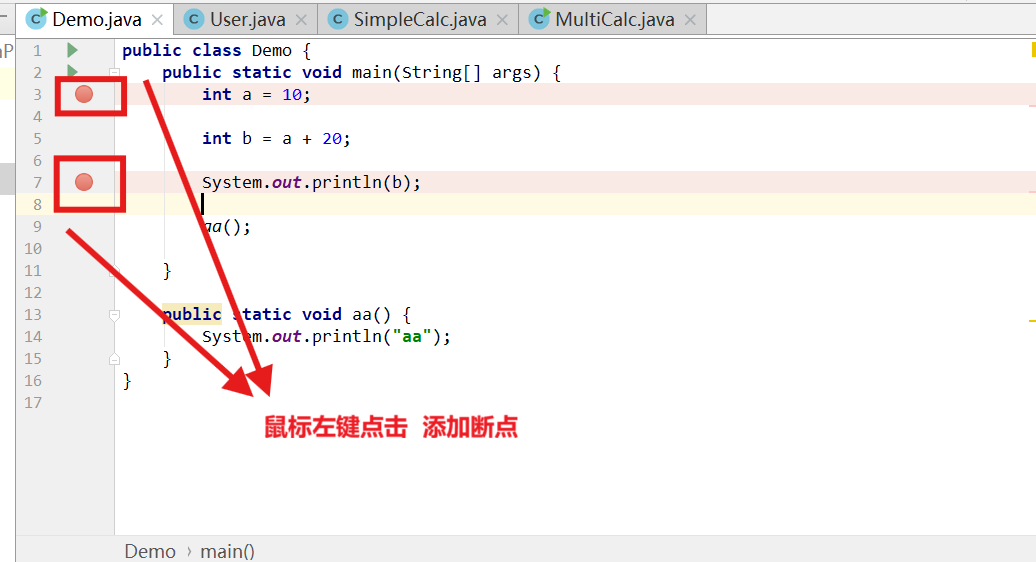 正常编写代码,需要调试的时候,可以在指定的位置加上断点(鼠标左键点击一下即可):