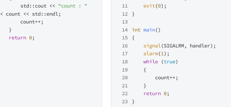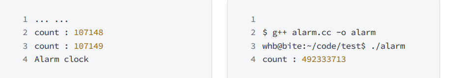 alarm可以体验IO效率低,cout就是往屏幕上打印,这样都是1秒之后进程终止,但是右边的count数字远远大于左边。