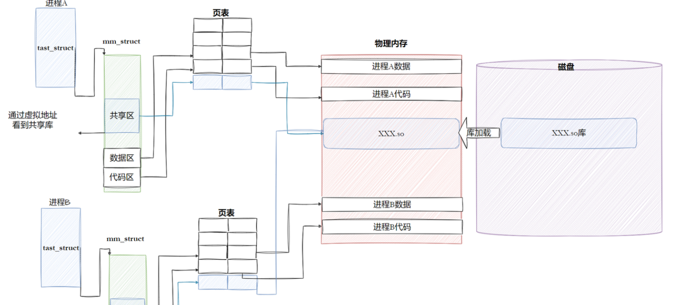 为什么说动态库只需要加载一份,是因为它把库加载到内存里,然后多个进程的共享区的页表都指向这个区域,就实现了进程间库的共享。这样多个进程只需要加载一份库就可以了。