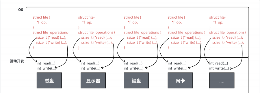 文件结构体file里面有一个指针,这个指针指向对应的系统调用,来对对应的底层进行相应的操作,这样我们只需要使用简单的write就可以往几乎任何硬件和软件进行写入了,接口调用是一致的,但是底层指向的系统调用可是不一样的,这些都是透明的。