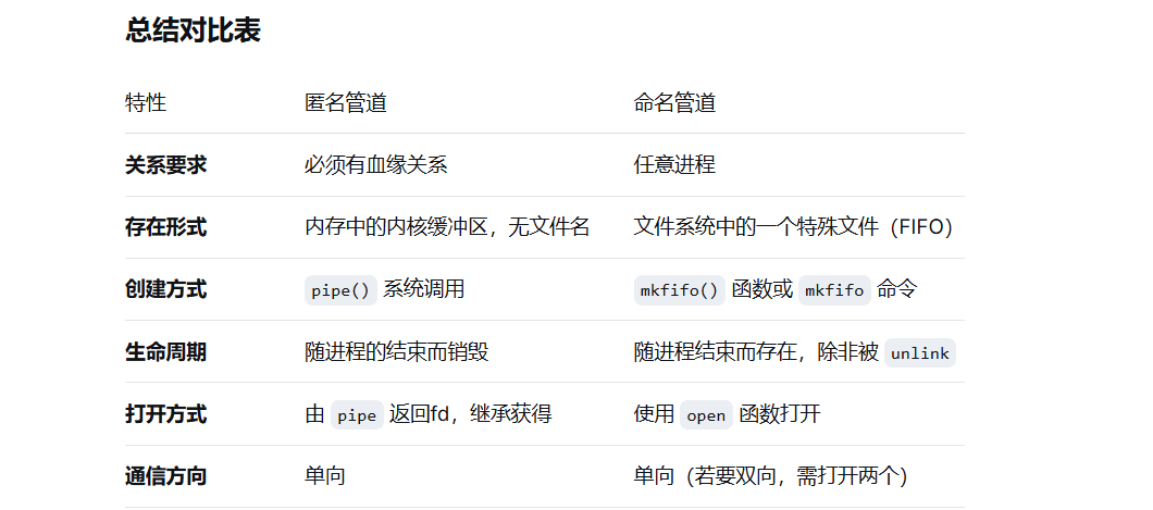 匿名管道是pipe,创建方式是pipr[fd[2]]命名管道是FIFO,创建方式是mkfifo filename(这种方式是命令行创建),程序里创建是int mkfifo(const char *filename,mode_t mode);