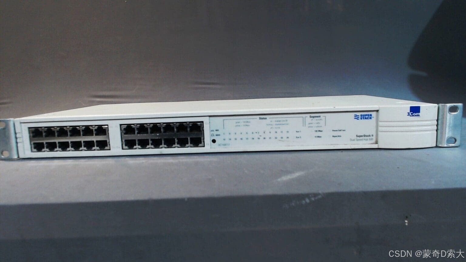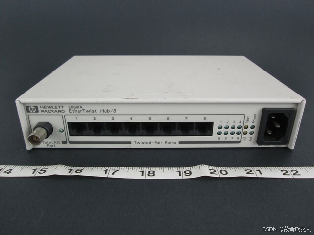 上图所展示的就是惠普 28691A 这款集线器,它能够连接同轴电缆和双绞线两种传输介质。但是它并非是单纯意义上的通过整形再生信号并转发信号的多端口中继器 ,它实质上是多端口中继器 + 介质转换器的多功能集线器,这类设备是集成化解决方案,而非一个简单的集线器。