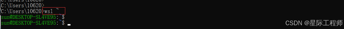 配置完成后,在windows的cmd窗口执行下面命令登录ubuntu,登录上后就直接进入了sun用户的家目录。