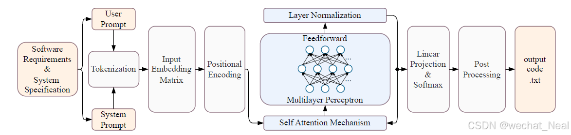 在图1所示的框架中,作为文本输入提供的给定需求被标记化,并通过输入嵌入进行处理,在那里通过位置编码进行丰富以保留顺序上下文。然后,标记通过一堆自注意力层和前馈多层感知器进行迭代传递。这些机制确保模型捕获输入需求中的局部和全局依赖关系。随后,处理后的标记经过线性投影和后处理步骤以生成序列中的下一个标记。这个迭代过程使得能够以连贯且与上下文相关的文本形式生成软件。利用大规模数据集进一步增强了在特定任务上训练或微调基础模型(如llama3 )的能力。例如,专为代码生成设计的LLM,如Qwen2.5-Coder ,从特定于任务的训练数据集中受益匪浅。LLM的性能在很大程度上受训练数据质量、提示设计和系统规范的影响。