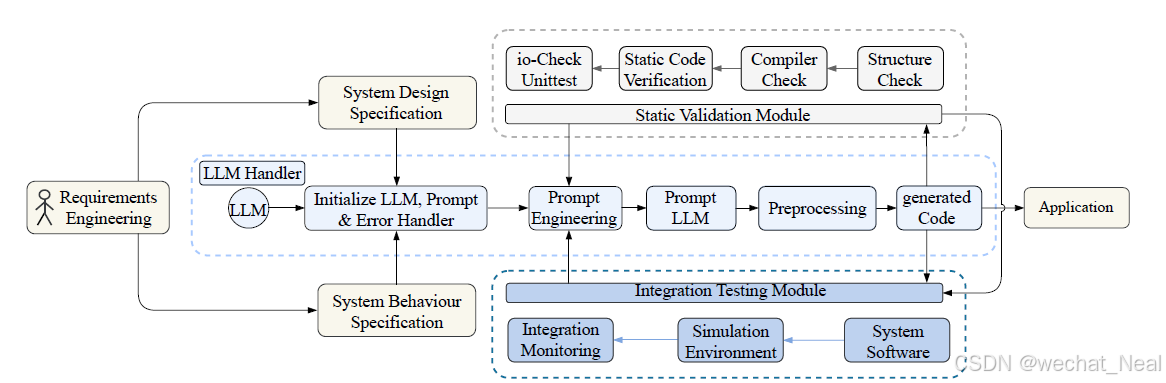 图 2:代码生成架构由三个组件组成:LLM处理器(浅蓝色)、静态验证模块(灰色)和集成测试模块(深蓝色)。用户(浅黄色)提供规范,LLM处理器生成可执行代码,该代码通过静态检查和集成测试进行迭代优化,以确保安全性和功能性。