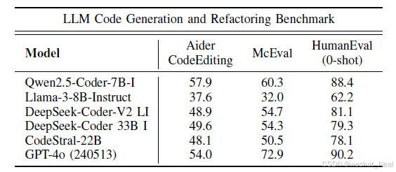 选择合适的LLM对于实现最佳结果至关重要。我们使用 McEval:大规模多语言代码评估 ,这是一个旨在评估LLM在40种编程语言(包括Rust和C++)中性能的基准,使用了16,000个测试用例。这为评估多语言代码生成提供了一个全面的框架。对于推理和迭代代码优化,我们采用Aider的代码编辑基准。它评估根据自然语言指令修改函数、实现缺失功能和重构代码的精确性和一致性。通过优先考虑编辑而非生成,Aider基准评估了在各种编程挑战中代码审查和优化的准确性和一致性,这对于需要强大迭代开发能力的框架至关重要。我们还包含了广为人知的HumanEval基准。