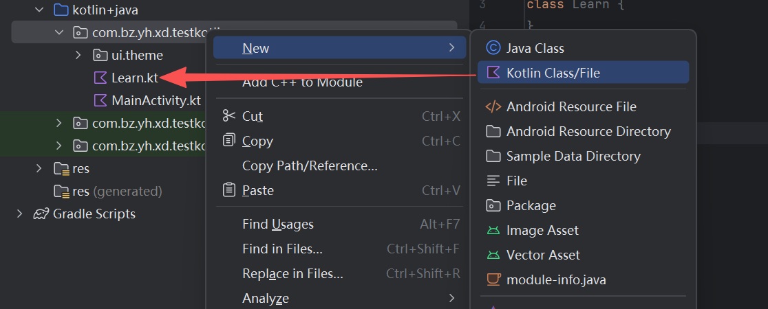 在android studio中创建一个kotlin语言的android项目,创建一个.kt文件learn。