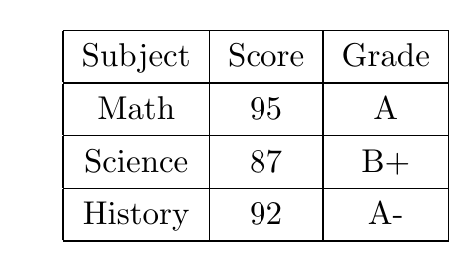 \begin{tabular}{|c|c|c|} % {|c|c|c|} 表示三列,居中对齐,列与列之间用竖线分隔