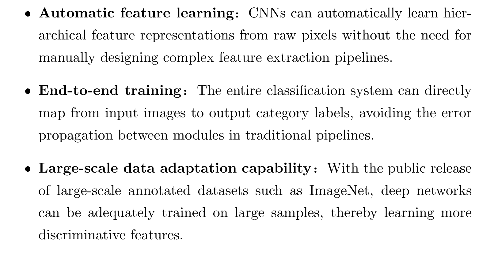 \item \textbf{End-to-end training}:The entire classification system can directly map from input images to output category labels, avoiding the error propagation between modules in traditional pipelines.
