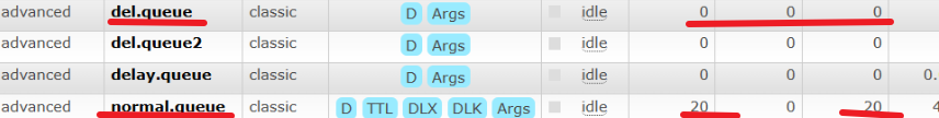 当我们发两条消息的时候,一条消息的延迟时间20秒,第二条消息的延迟时间10秒,当两条消息都被丢到队列中,只会检查队头的元素是否过期,当检测到队头已过期,把它丢到死信交换机中,执行第二条消息,我们发现第二条早已经过期,消息会随着第一条消息一起被死信交换机发送出去,时间是相同的,在发送消息的时候并不会因为第二条消息的延迟时间短而先得到执行