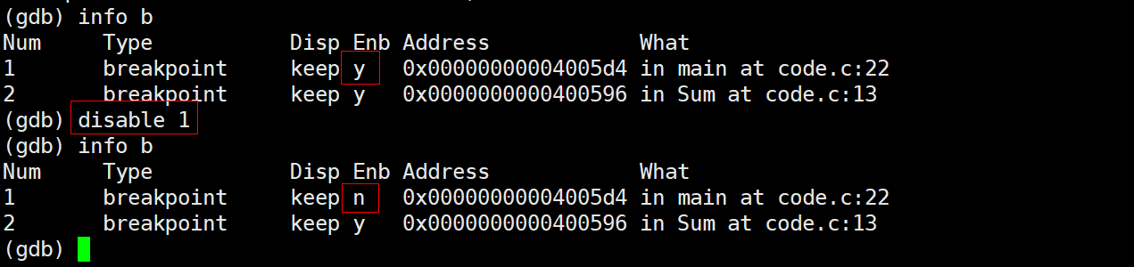 每次设置断点都会有断点编号Num,不能d 行号,而是d 断点编号disable 断点编号:禁用指定的断点enable 断点编号:启用指定的断点disable breakpoints:禁用所有断点enable breakpoints:启用所有断点