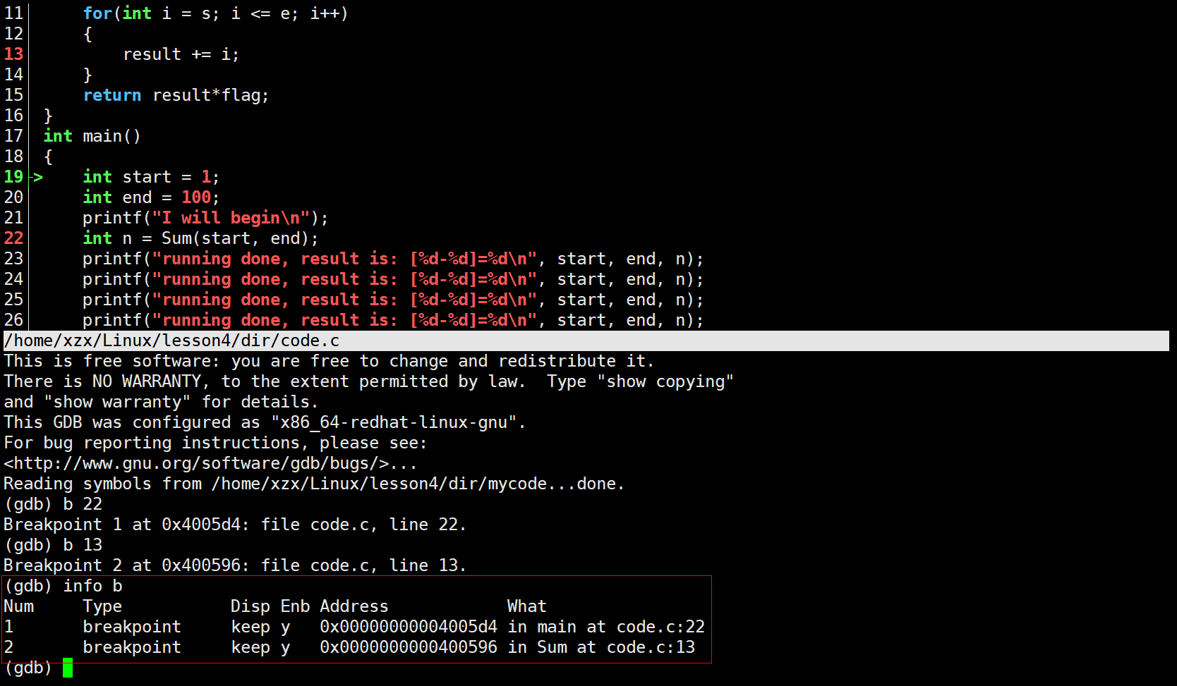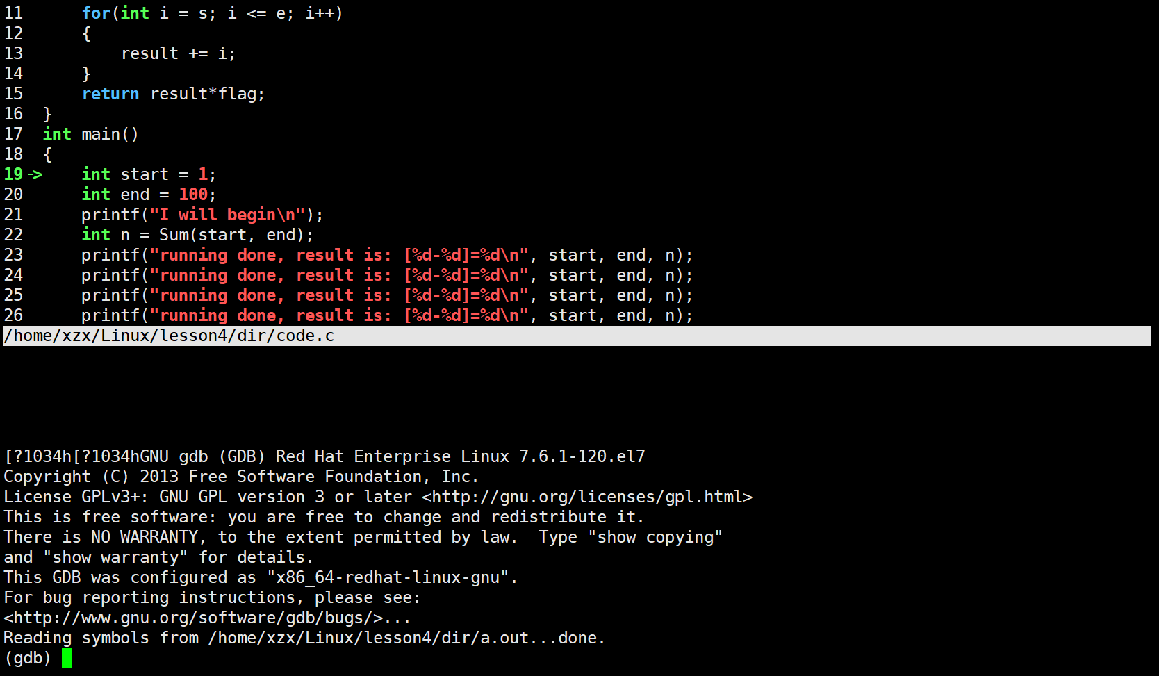 cgdb的分屏操作:按ESC进入代码屏,按i回到gdb屏。