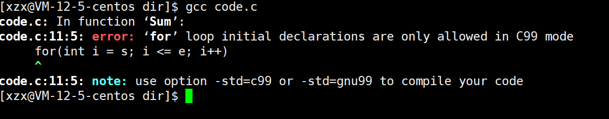 使用gcc编译代码时,默认使用的是C98,因为C98不支持for循环中定义变量,所以它这里提示我们使用C99
