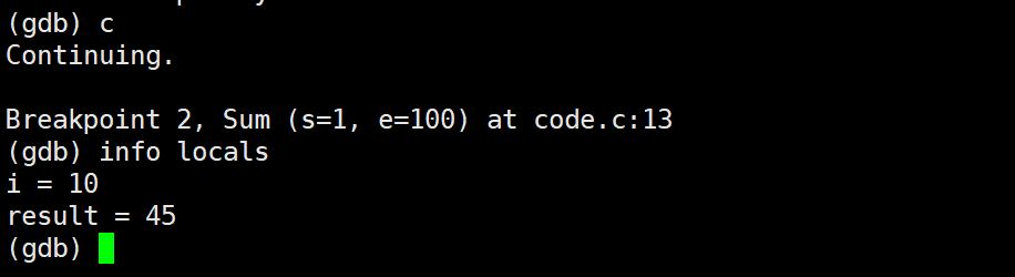 list/l:显示源代码,从上次位置开始,每次列出10行list/l 函数名:列出指定函数的源代码list/l 文件名:行号:列出指定文件的源代码r/run:从程序入口main函数开始执行代码n/next:单步执行,不进入函数内部,相当于vs调试中的逐过程F10s/step:单步执行,进入函数内部,相当于vs调试中的逐过程F11break/b [文件名:]行号:在指定行号设置断点。比如:break 10、break test.c:10break/b 函数名:在函数开头设置断点。比如:break maininfo break/b:查看当前所有断点的信息。比如:info break/info bfinish:执行到当前函数返回,然后停止。print/p 表达式:打印表达式的值。比如:print start+endp 变量:打印指定变量的值。比如:p xset var 变量=值:修改变量的值。比如:set var i=10continue/c:从当前位置开始连续执行程序delete/d n(断点编号):删除序号为n的断点delete/d breakpoints:删除所有断点