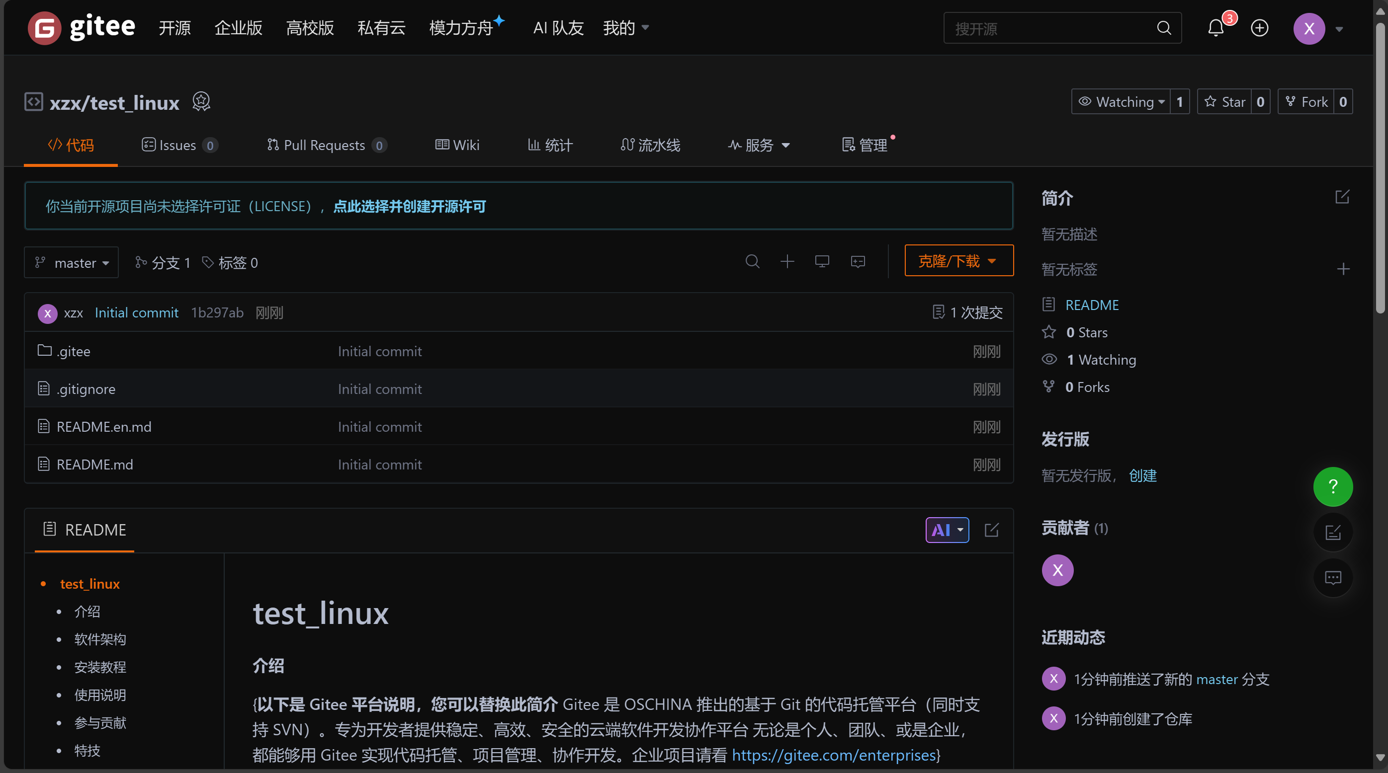 - 初始化仓库:是否自动构建初始文件(如 README.md、.gitignore、开源许可证等)