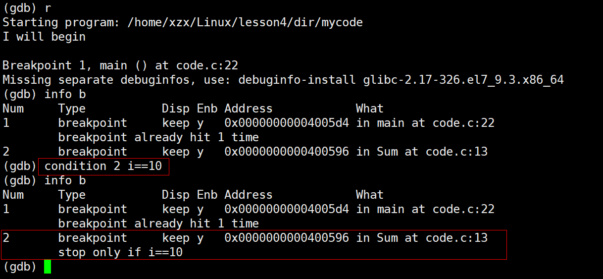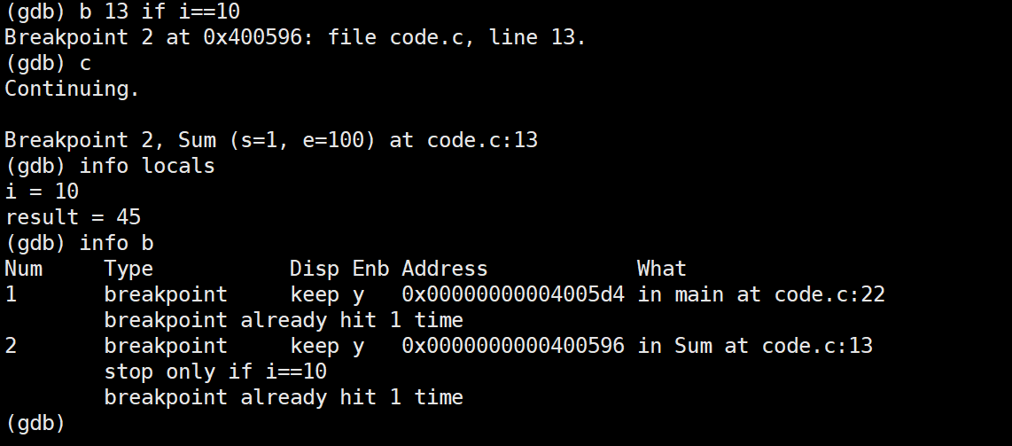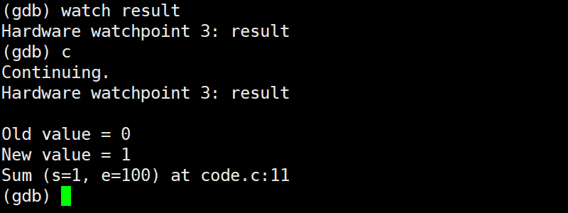 功能:执行时监视一个表达式(如变量)的值。如果监视的表达式在程序运行期间的值发生变化,GDB会暂停程序的执行,并且提示。