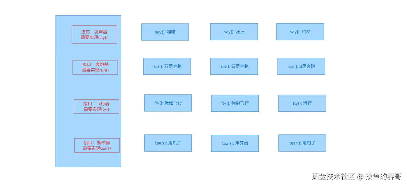 在这样的抽象细粒度里,动物的特性可以通过茫茫多不同的组合来实现。