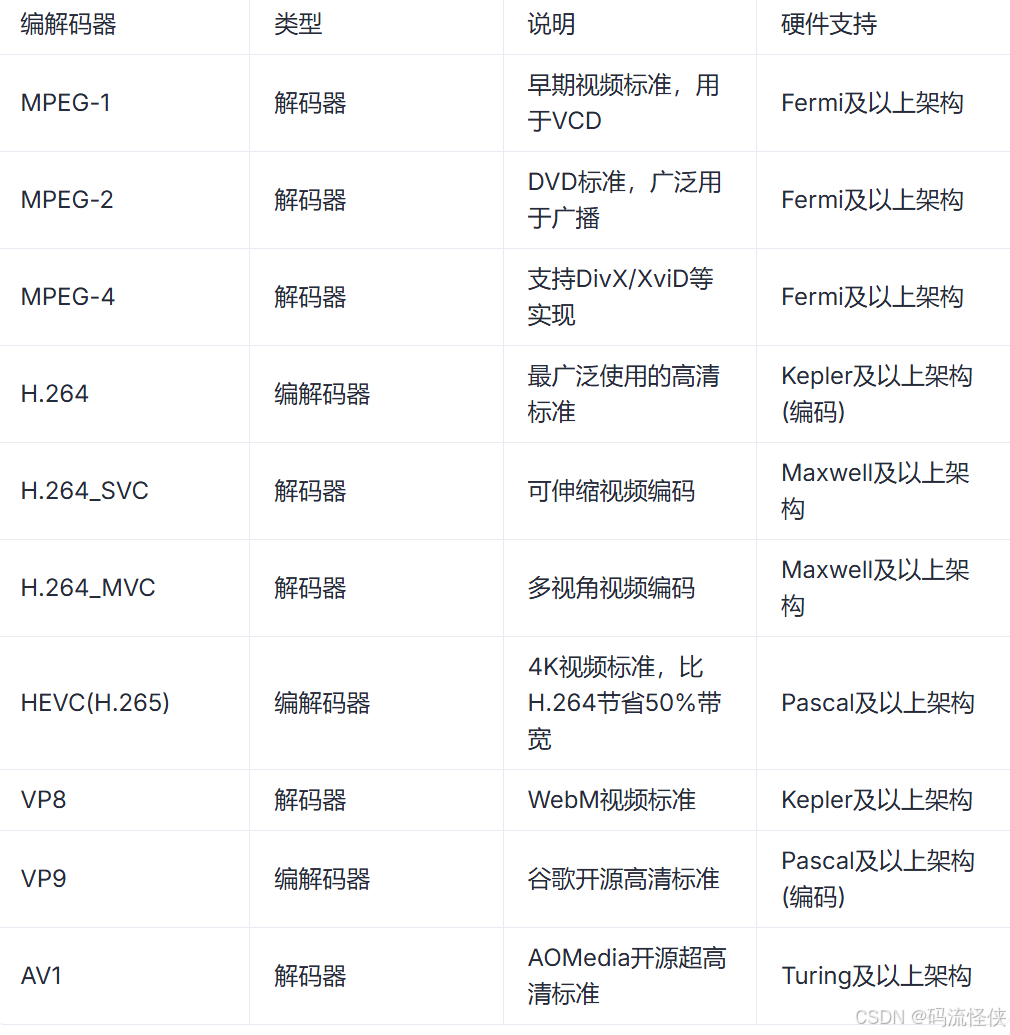 OpenCV的CUDA编解码模块(cv::cudacodec)是高性能视频处理的核心,支持从MPEG-1到AV1的全系列视频标准。通过NVIDIA硬件编码器( NVENC )和解码器( NVDEC ),可实现比CPU编解码高达10倍的性能提升。