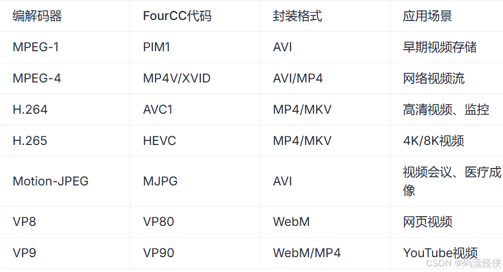 FourCC(四字符代码)是OpenCV中指定视频编解码器的关键参数,常见设置包括: