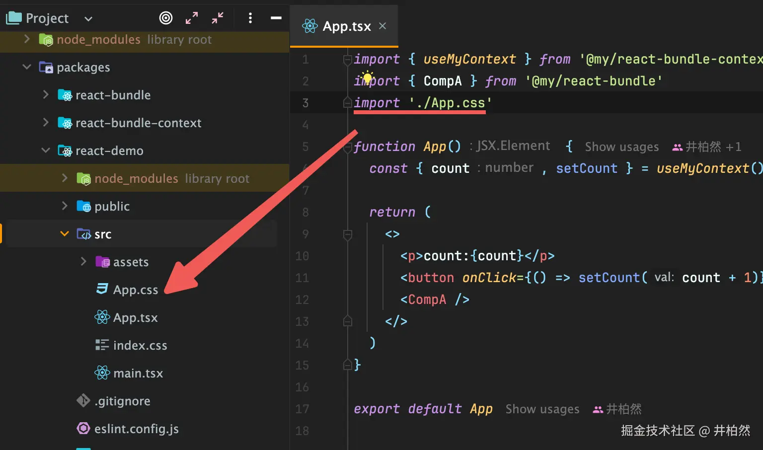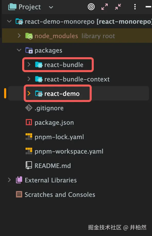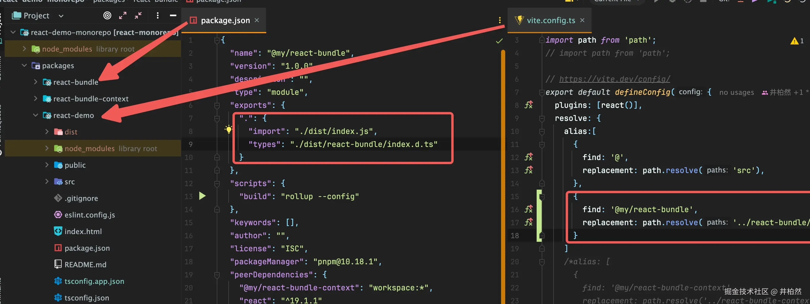 这里我还是回到同一个 react 的 monorepo 工程中进行讲解。比如我要开发一个 npm 包:react-bundle,并且我通过 react-demo 这个单页应用的项目作为代码调试的工程,它提供一个 vite dev 的环境能让我们很方便的开发调试 react-bundle 的 js包: