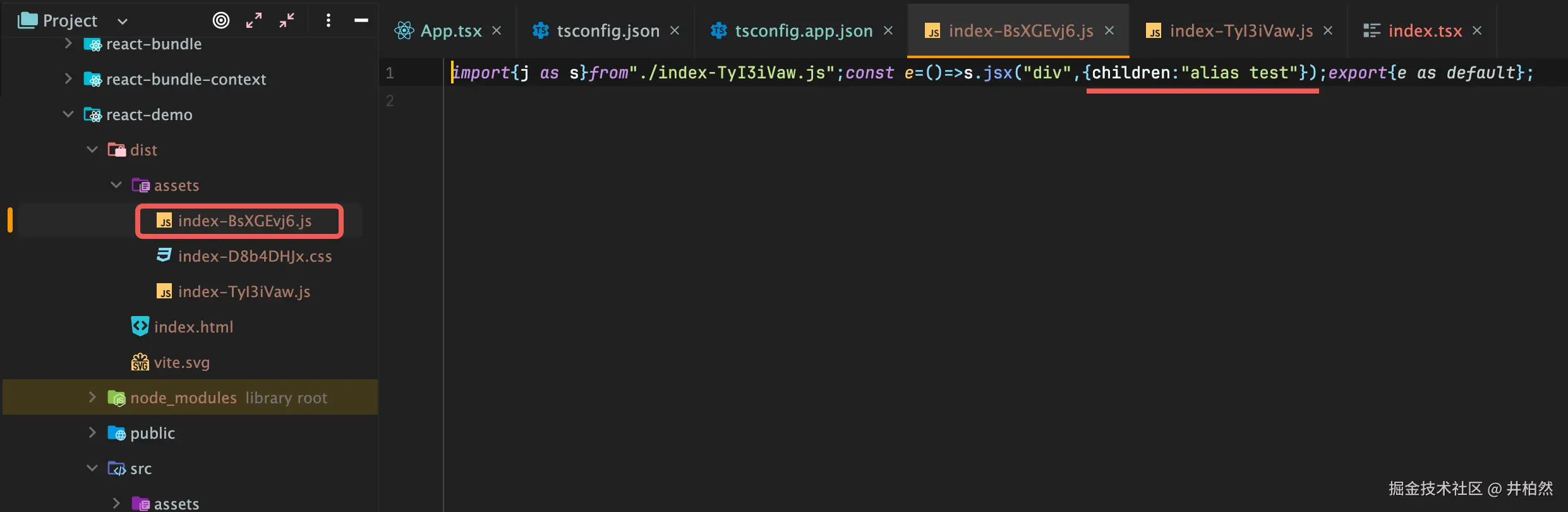 产物结果如下,此时的 AliasTest 组件被打包成了 index-BsXGEvj6.js 文件: