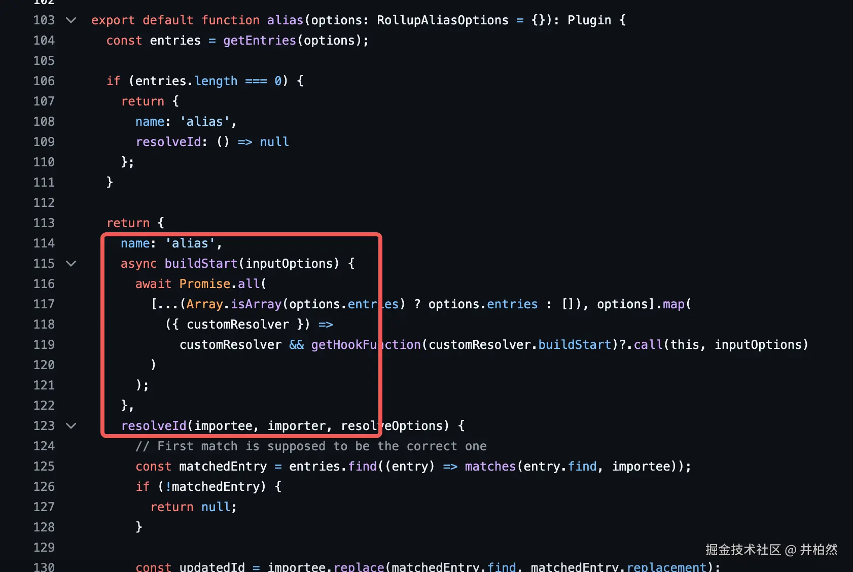 我们看 vite 文档 对其的介绍可知,它的底层实现是一个 rollup 插件:@rollup/plugin-alias。当我们点进去这个插件的 源码 大概看了看,有写过 vite 或者 rollup 插件的同学可能就发现了两个熟悉的钩子: