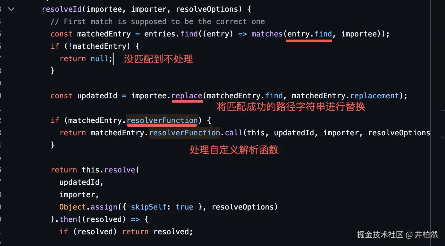 只要我们简单看看 @rollup/plugin-alias 的源码,大概就能猜到 alias 的底层实现原理了,如下图: