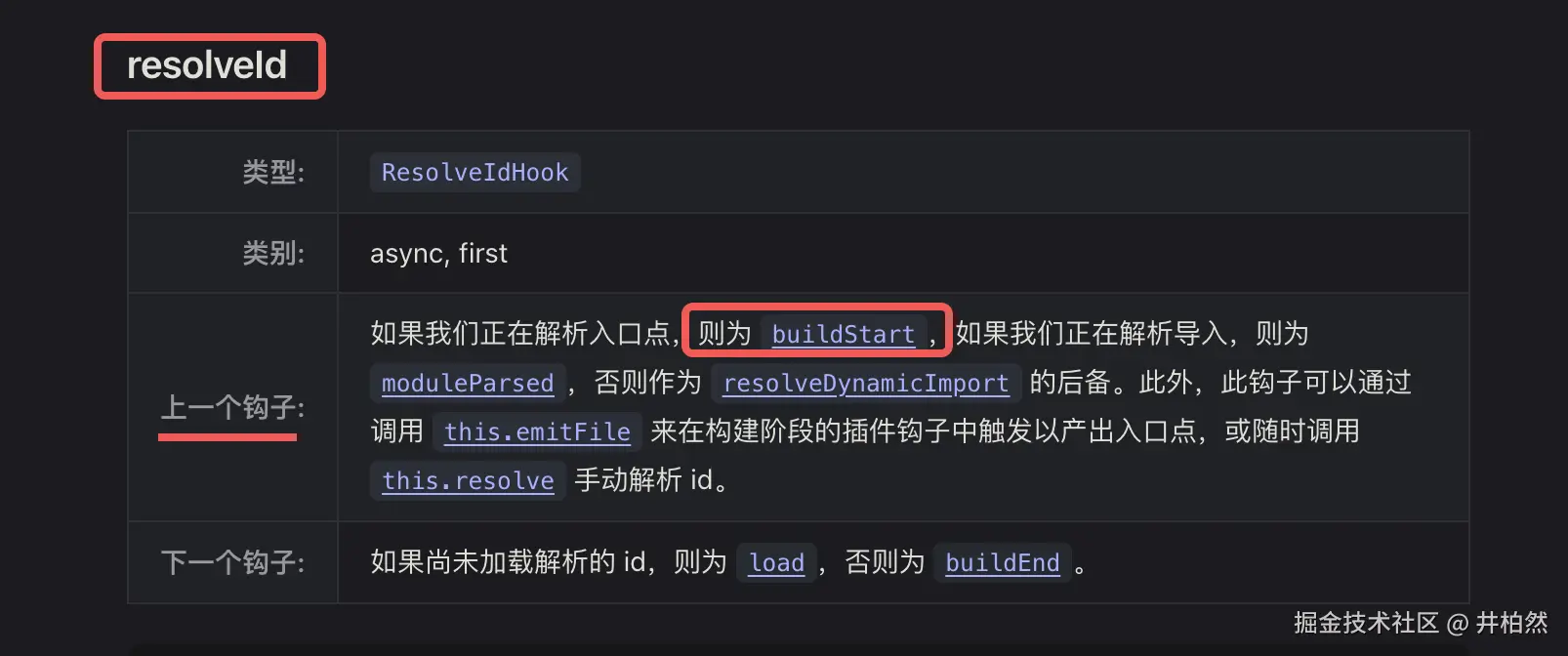 buildStart 和 resolveId。这两个钩子我们在 rollup 的插件文档中可以直接看到: