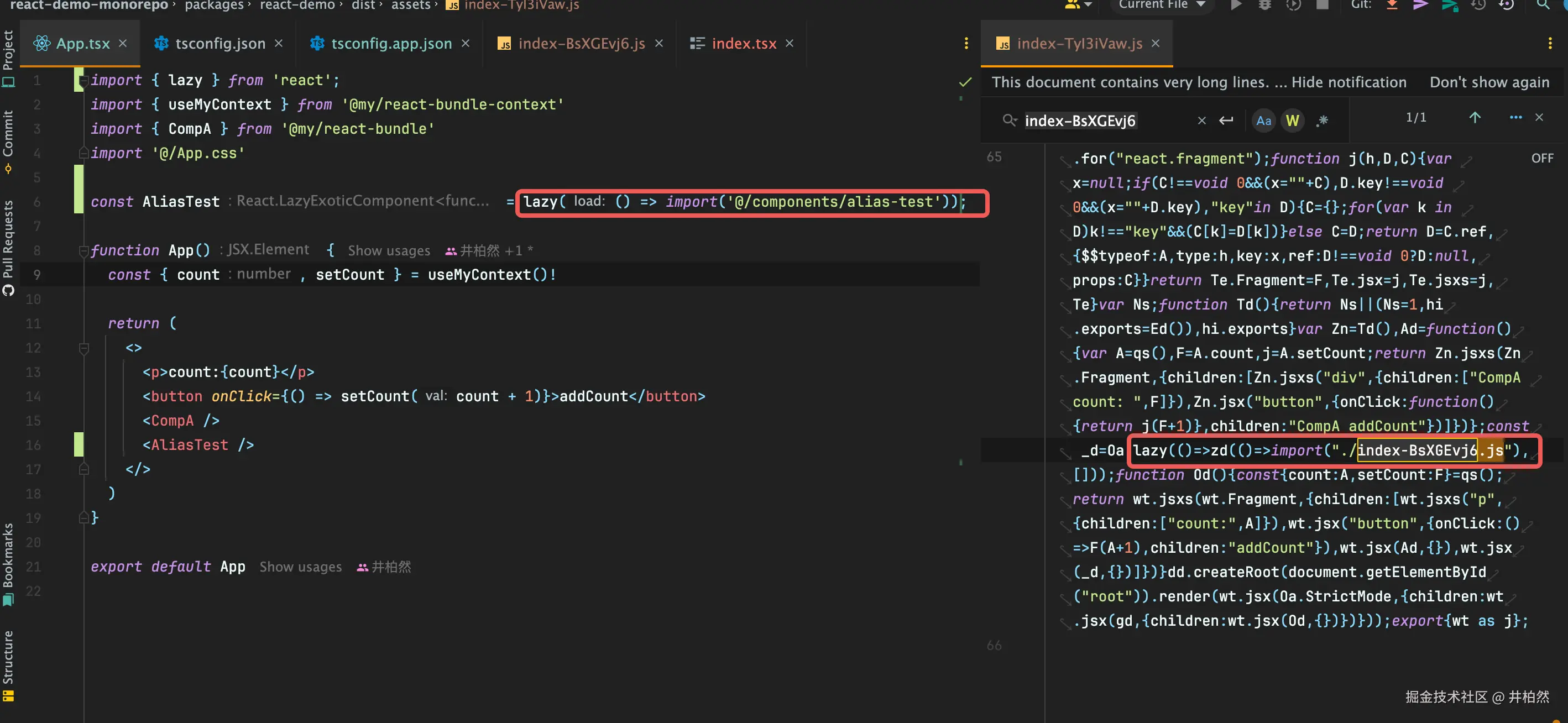 有经验的都知道,此时我们的源文件的导入路径是不会变化的(也就是说不修改源文件),所以我们可以认为这是 dev 服务器的实现。紧接着我们对这个 react-demo 的单页应用进行打包,再看看 @ 这个别名的变化情况。(我特意使用了 lazy 引入,就为了分包出来看得清晰点)