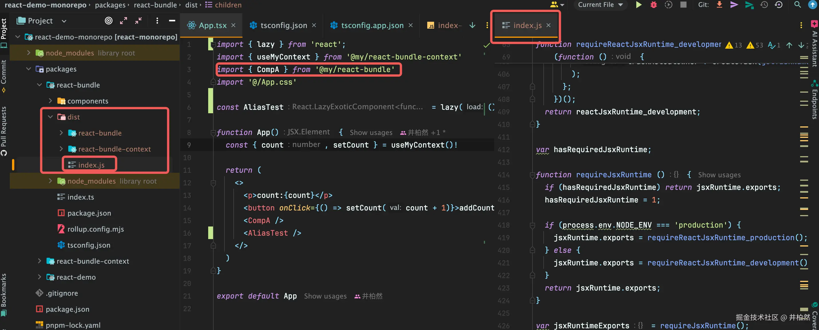 回顾上一篇文章------从 Monorepo 重温 ESM 的模块化机制中提到的模块解析规则,package.json 中的入口字段决定着 node 的模块解析如何找到最终对应的文件,所以当我们需要在 react-demo 中启动 dev 能调试到 react-bundle 时,我们必须要正确地安装好依赖并且 react-bundle 的入口配置正确。