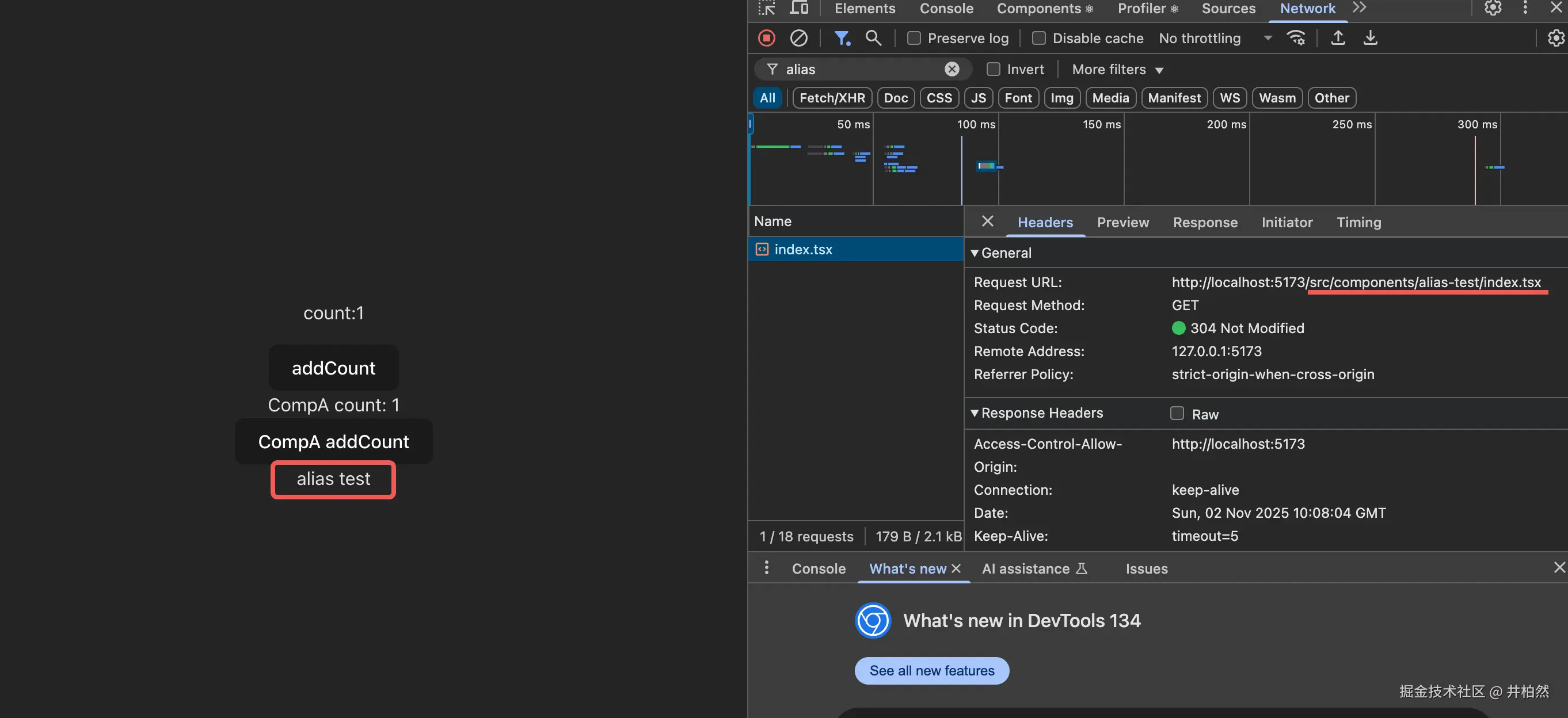 基于此我们可以简单拓展下,大家都知道 vite 的 dev mode 下是不打包文件的,通过直接启动开发服务器并借助浏览器原生支持的 import 能力进行模块的按需导入。那我们大概可以猜测到 dev 和 build 模式下的 alias 表象是有区别的。