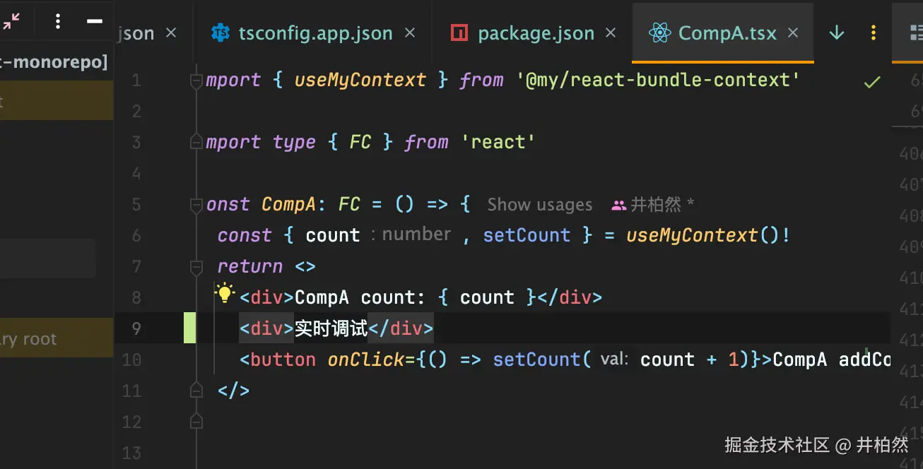 此时在 react-bundle 的每一行修改都实时反馈到 react-demo 的 dev 调试 web 中了,让我们这些 npm 包开发者感受到了无比的愉悦。比如我修改了一下 react-bundle 中的代码: